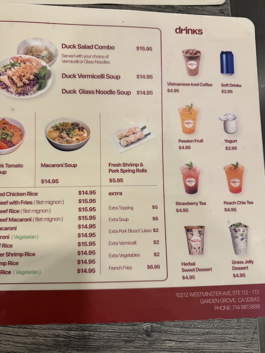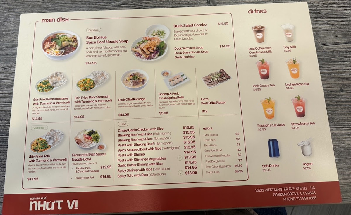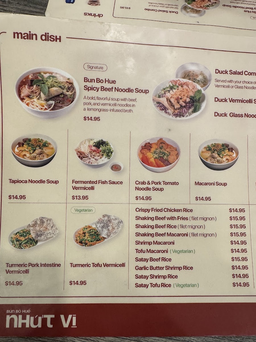 The menu at Bún bò huế NHỨT VỊ offers a variety of traditional Vietnamese dishes focusing on noodle soups, rice dishes, and light protein-based meals. The main food selections include signature noodle dishes such as Bun Bo Hue, Bun Cha, Bun Rieu, and Hu Tieu, alongside other options like Duck Salad Combo served with a choice of rice porridge, vermicelli, or glass noodles. Additionally, there are stir-fried specialties like Stir-Fried Pork Intestines with Turmeric and Vermicelli, as well as crispy garlic chicken with rice.